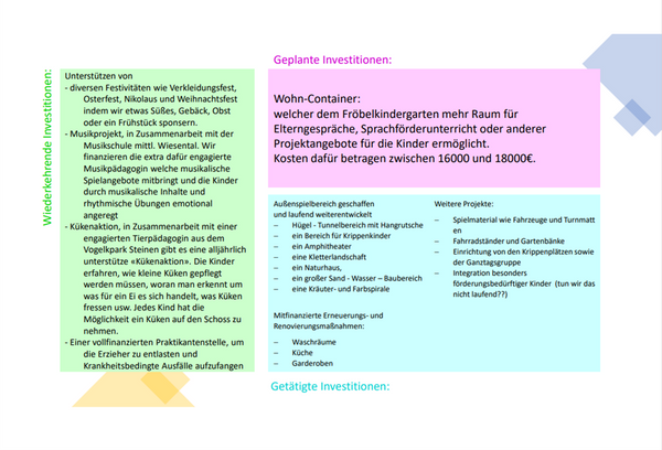 Erzieher*innen können vom Förderverein finanziellen Mittel für zusätzliche Ressourcen, beispielsweise in Form einer vollfinanzierten Praktikantenstelle erhalten. Dies kann dazu beitragen, die Qualität der Gruppenarbeit zu verbessern und krankheitsbedingte Ausfälle aufzufangen.